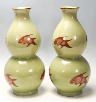 A pair of 20th Century Chinese Republic period green celadon glazed double gourd vases decorated with Koi Carp. Qian Long marks to the base. Four character reign seal marks to the underside. Measures 37cm high.
