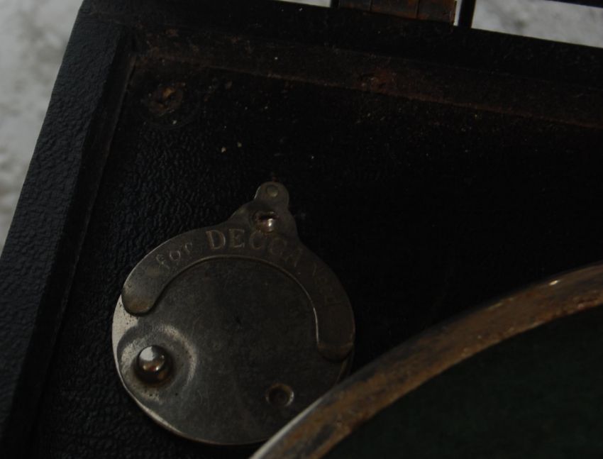 An early 20th Century portable / table top Decca gramophone having a black leatherette case  with chrome metal fittings and green blazie lined turntable.