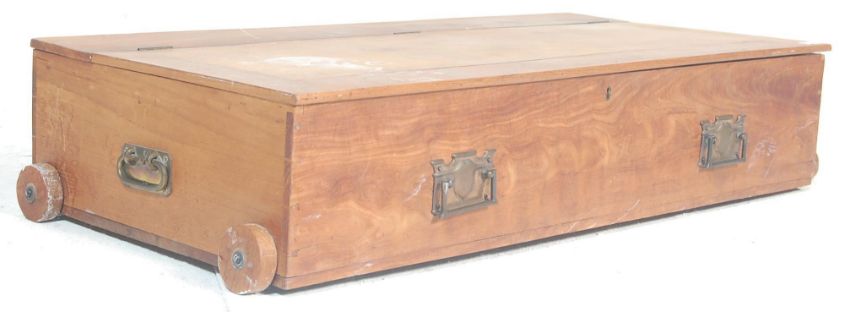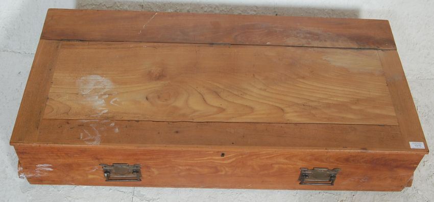 A Victorian  19th century under bed storage blanket box converted from a drawer with brass handles, hinged top above. Together with another small blanket box trunk with metal banded sides.