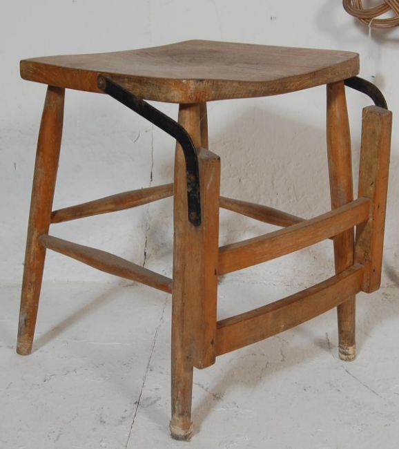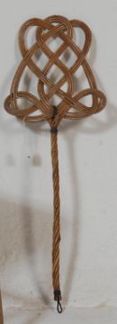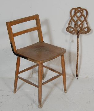 A vintage 1030's oak child's chair / teddy bear chair having metamorphic backrest, raised on tapered supports united by stretchers. Together with a vintage wave rattan carpet beater.