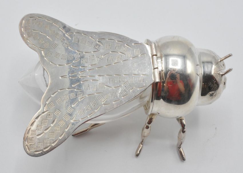A silver plated and blue glass honey pot in the form of a bee having chased decorated hinged wings with clear glass abdomen pot etc. 15cms long