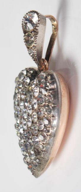 A 20th Century silver and paste stone set pendant in the form of a heart having a paste set bale and gold back. Unmarked. Measures 4 cm high (Including bale). Weight 6.4g.