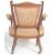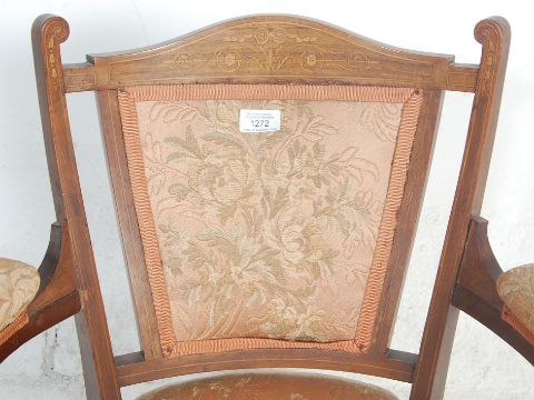 A late Victorian 19th century mahogany inlaid armchair. Raised on square tapering legs with castors having overstuffed seat and back rest. The fan shaped backrest with pierced uprights and marquetry inlaid top rail. All flanked by upholstered elbow rests raised on turned column supports.