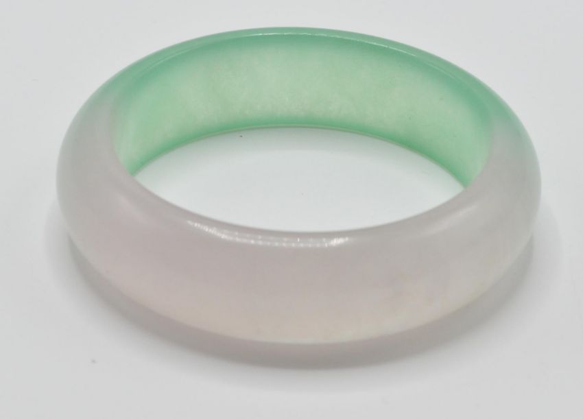 A 20th century ladies oriental Chinese green jade colour bangle, having half moon shape. Measures 8cm diameter, weight: 79g.