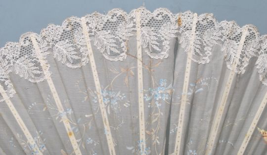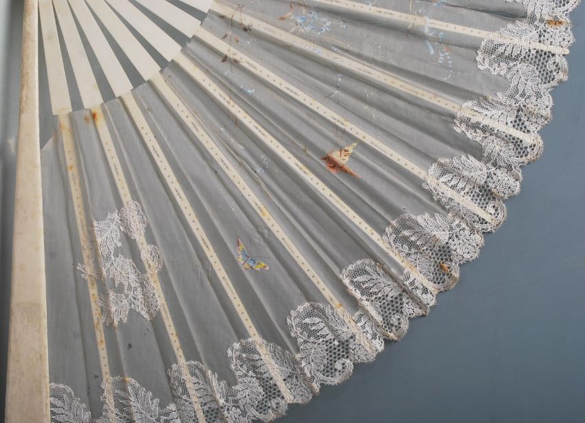 A late 19th / early 20th Century bone and lace hand fan being hand painted with butterflies and florals culminating in a lace rim.
