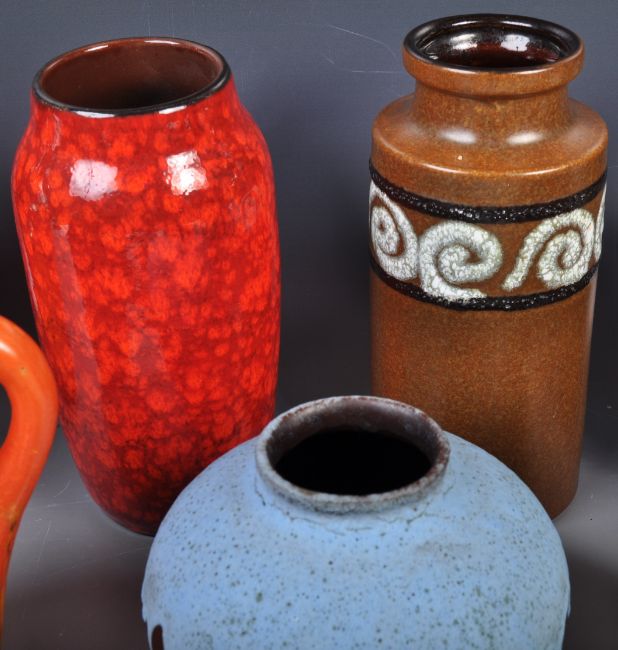 A great collection of original mid 20th Century West German Fat Lava studio art pottery vases and plates comprising a Scheurich 490 25 242 22 mottled flambe, 4301 flambe jug, Belgium 2114 jug, 102 28, 603 13 vase, matching set of three items, 728 plate depicting a white horse and a crackle glaze textured plate. Fantastic examples. Largest measures 28cm tall.