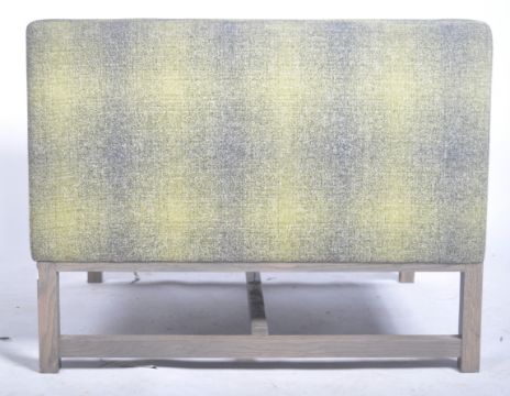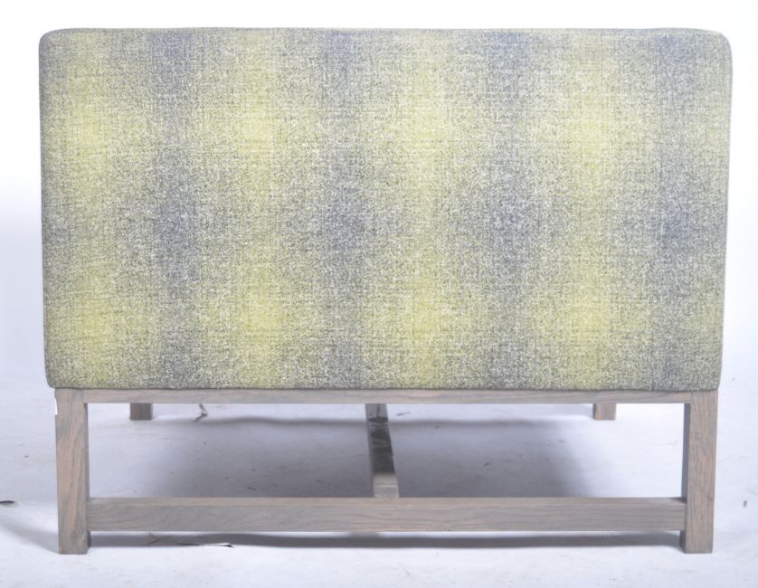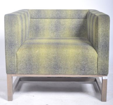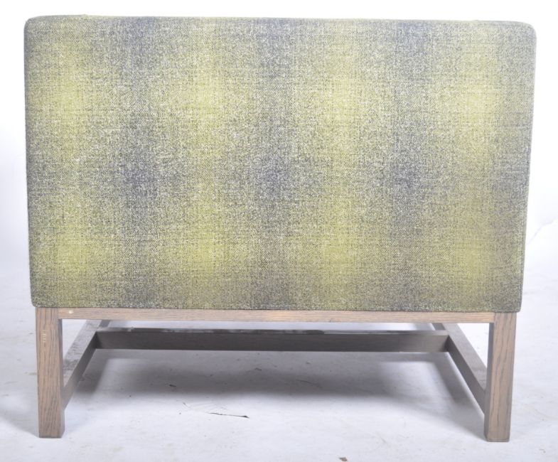 Lyndon Design - Orten Armchair - A fantastic contemporary retro style lounge chair / armchair by Lydon Design the Orten Chair. The armchair upholstered in a green and grey fabric with cushioned seat rest. Raised on square supports united by H stretcher. Over £2000 to buy new.