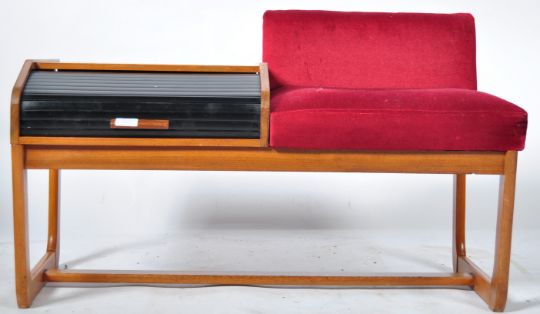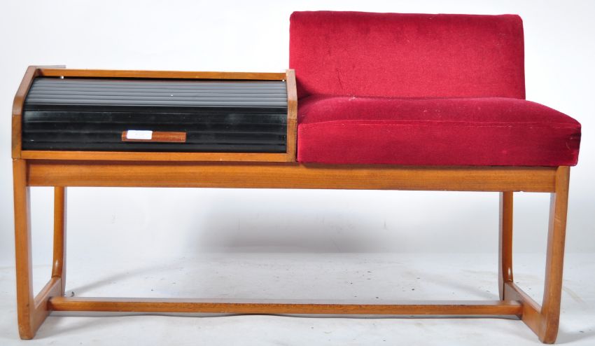 Myer - A 20th Century retro vintage British high end design teak wood telephone table / hall table window seat having a stunning black tambor fronted section adjacent to the red cushioned seat. All raised on ' quadrille ' type supports. Measures:  58cm x 91cm x 48cm.