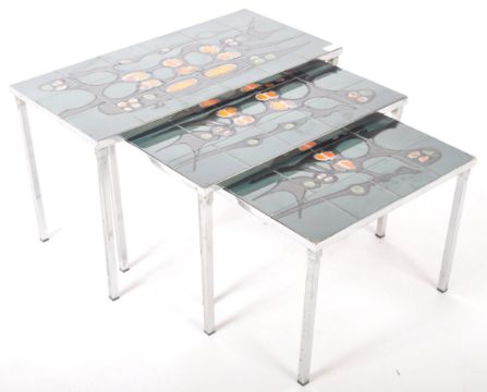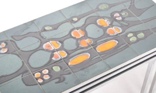A good 20th Century 1970's retro vintage chrome and tile top coffee nest of tables in the manner of Adri. Each table set with ceramic painted tiles having abstract decoration with a chrome frame raised on straight chrome supports. Biggest measures 39cm X 66cm x 33cm.