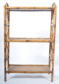 A good 20th Century vintage three tier open display bookcase shelving unit of bamboo construction. The bookcase having open bentwood bamboo sides with peg joints supporting each shelf. Measures 107cm x 66cm x 31cm.