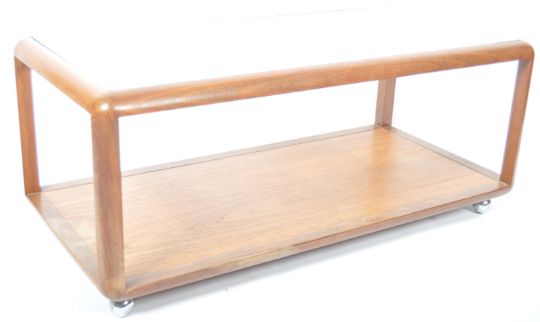 G Plan - A fabulous mid 20th Century retro vintage teak framed two tier coffee table by G-Plan. The coffee table of rectangular form having rounded corners and supports set with a glass panel top with lower teak wood tier below. All raised on chromed castors. Measures 48cm x 111cm 53cm.