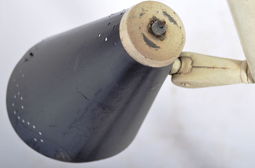 An unusual 20th Century retro vintage spot lamp light of metal construction having three adjustable black finished shade. Raised on black and white metal stem of tapering form. Measures 132cm.
