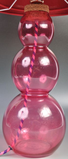 A 20th Century retro vintage style studio art glass triple gourd pink glass vase converted into a table lamp light. The lamp having a stylish pink shade with pink and purple cord. Measures 56cm x 28cm.