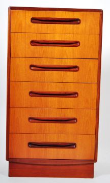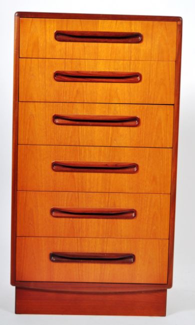 Victor B Wilkins - G Plan - Fresco Range - An original 20th Century retro vintage teak wood upright pedestal chest of drawers by Victor Wilkins for G-plan. The chest being raised on a plinth base with an upright bank of six drawers having lozenge shaped recessed handles with the sides of the chest being chamfered. Measures 104cm x 56cm x 44cm.