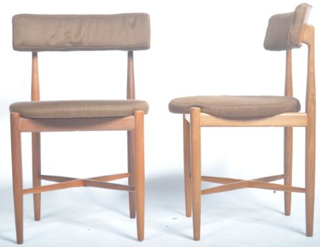 Victor B. Wilkins - G-Plan - Fresco Range - A 20th Century 1960's retro vintage dining suite comprising of a Fresco teak wood round extending dining table raised on tapering supports. Together with a set of six matching round G-Plan chairs having brown fabric seat pads and backrests. Table measures 74 cm x 122 cm.