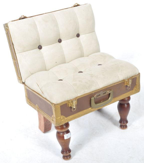 An unusual contemporary small child's seat / low bedroom chair in the form of a suitcase / chest having a upholstered button back backrest and seat rest. The case finished in brown with gilt detailing, all raised on turned legs. Measures 55cm x 47cm x 40cm.