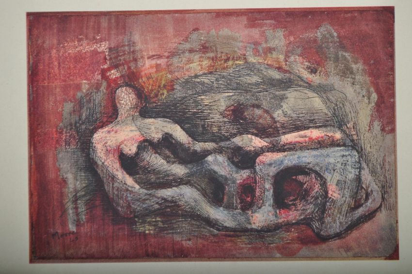 Henry Moore - British Artist 1898-1986 - A good group of three abstract watercolour and drawing painting prints by Henry Moore. Each print of different subjects with one finished on textured paper. One depicting a reclining figure and another with multiple abstract figures. Biggest measures 56cm x 42cm.