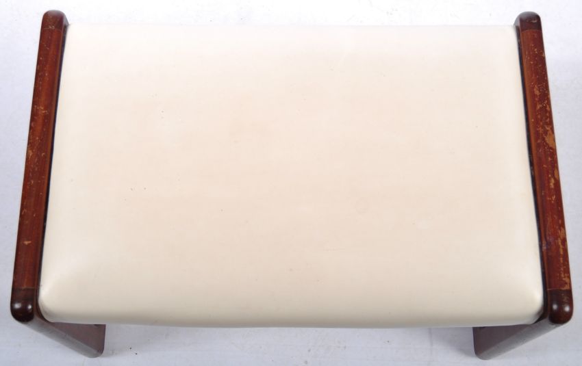 A 20th Century retro vintage Danish teak wood dressing table stool in the manner of G Plan having a cream vinyl cushion seat raised on oblond square ' Quadrille ' type supports. Measures 40cm x 61cm x 38cm