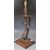A good 20th century wrought iron sculptural industrial table / bedside lamp. The main body of interlinked iron form, leading to a brass bulb fitment atop. Mounted to a wooden stepped base. Measures approx; 56cm tall.