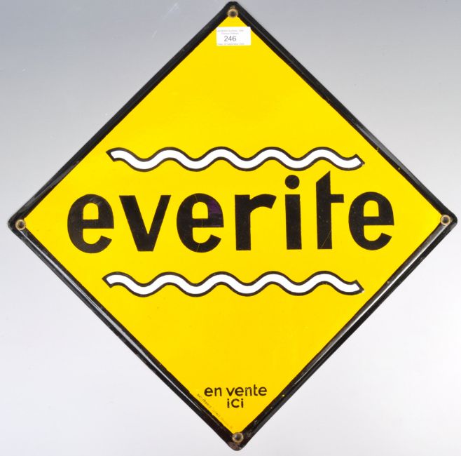 Everite - A 20th century French retro vintage enamel porcelain advertising shop display sign for 'Everite En Vente ici' of lozenge shape. The sign having yellow ground with black border and lettering with white wave line decoration. Measures 50cm x 50cm.