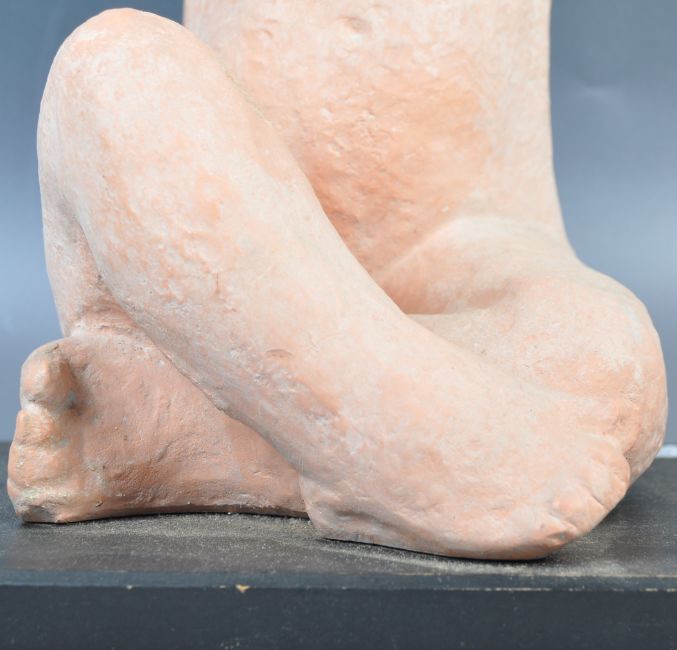 Austin Sculpture - A large and impressive 20th Century American hand sculpted terracotta / plaster composite figurine depicting a seated child with hand raised and finger in mouth. Raised on wooden plinth base. Measures: 42cm.