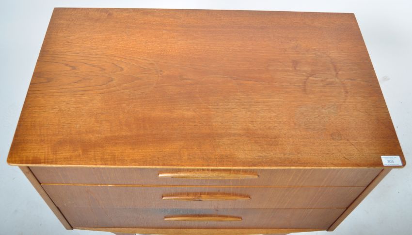 Geoffrey B. Jenkins - Jentique - A brilliant 20th Century retro vintage teak wood popup student's bureau desk / chest of drawers of small proportions by Geoffrey Jenkins for Jentique. The rectangular top lifting and sliding forward to reveal a pop up fitted interior to the back. Below are three drawers having recessed handles, all raised on tapering supports. Impressed marks to the back. Measures 74cm x 78cm x 44cm.