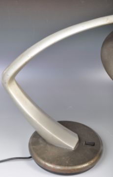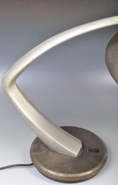 Fase - Madrid Spain - Boomerang 64 - A superb mid 20th Century 1960's retro vintage table / desk lamp light by Fase of Madrid Spain, Boomerang model 64. The lamp having a U.F.O saucer shade finished in the original grey colorway housing a twin bulb socket supported by a steel bevelled boomerang shaped neck. Raised on a circular swivel action base with push button to the front. Measures 39cm x 56cm.