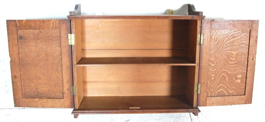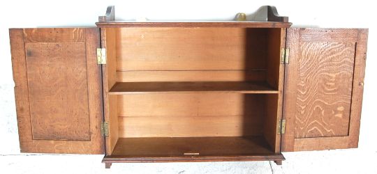 A Victorian 19th century solid oak hanging cabinet. Of rectangular form with twin heavily carved fielded panel doors housing shelves set within. The sides with raised gallery serpentine edges. Measures 60 x 60 x 25 cm.