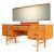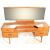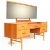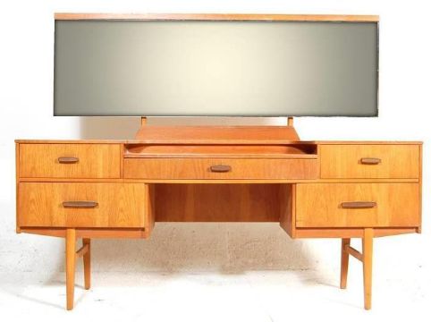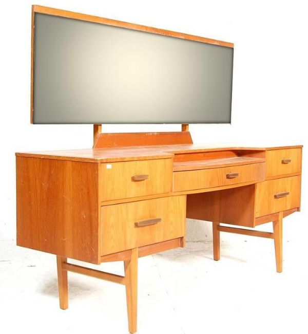 A good retro vintage 20th century teak dressing table in the manner of Mogens Kolo with drop centre, brass handles to the drawers having an adjustable mirror. The central single drawer flanked by further drawers each end. All raised on tapered supports. Measures 119cm x 150cm x 45cm.