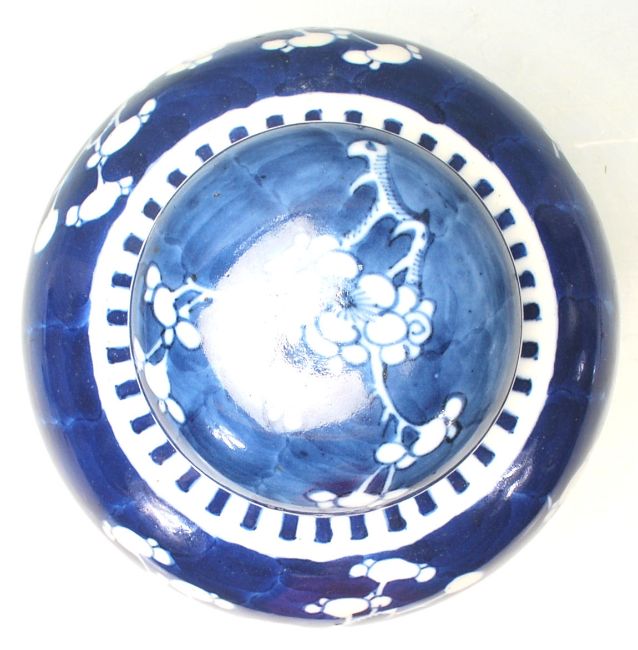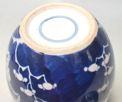 A 19th Century Chinese oriental ginger jar of bulbous form being hand painted in blue and white in the prunus pattern with geometric borders to the rim. Blue circle mark to the base. Measures 20 cm tall.