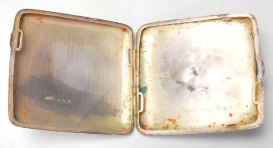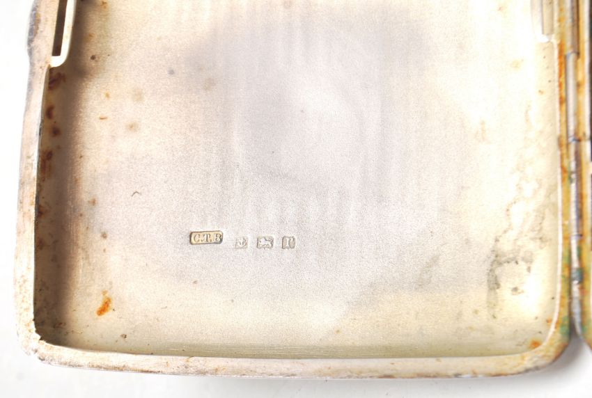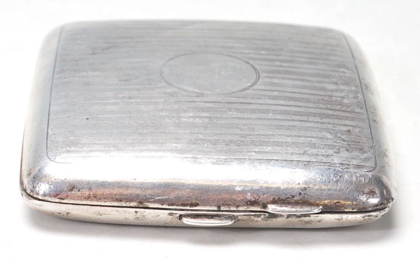 An early 20th century silver hallmarked cigarette case having engine turned decoration with a circular central panel, hinged lid and hallmarks to the inside. Silver hallmarks for Birmingham 1916 by C T Burrows & Sons (Charles Turman Burrows). Weight: 94.78g. Measures 9 cm x 9 cm.