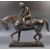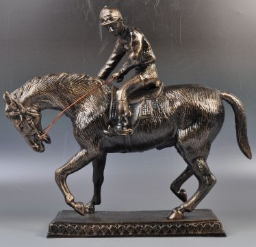 A large 20th century decorative bronze effect cast metal statue of a Jockey & Horse. Modelled in traditional form, with the jockey atop the horse, holding reigns. Mounted on a squared decorative base. Measures approx; 42cm tall.