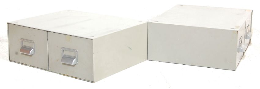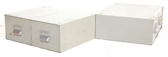 A pair of vintage 20th Century office metal desk top drawers, each having twin drawers with chromed pull handles and label windows, retaining original grey paintwork. Measures: 17cm high x 45cm wide x 36cm deep.