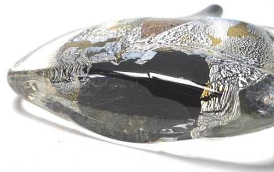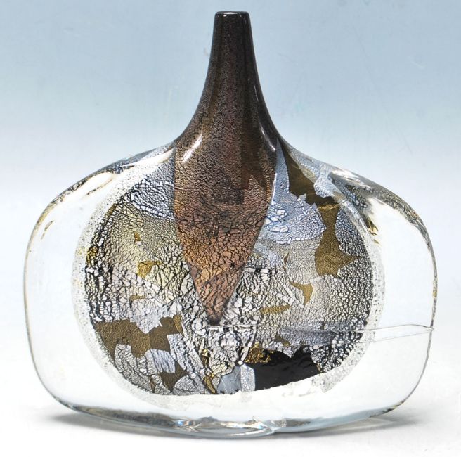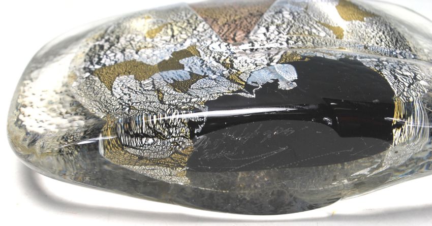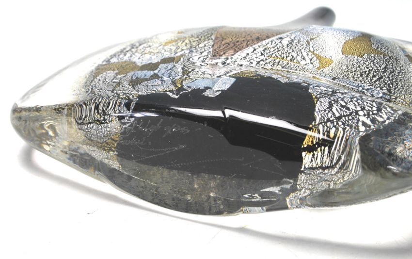 Michael Harris - Isle of Wight Glass. A later 20th Century Isle of Wight glass Black Azurene Fish vase, internally decorated with silver and gold aventurine over a dark ground and heavily cased in clear crystal. All in the manner of Michael Harris. Measures 18 cm tall.