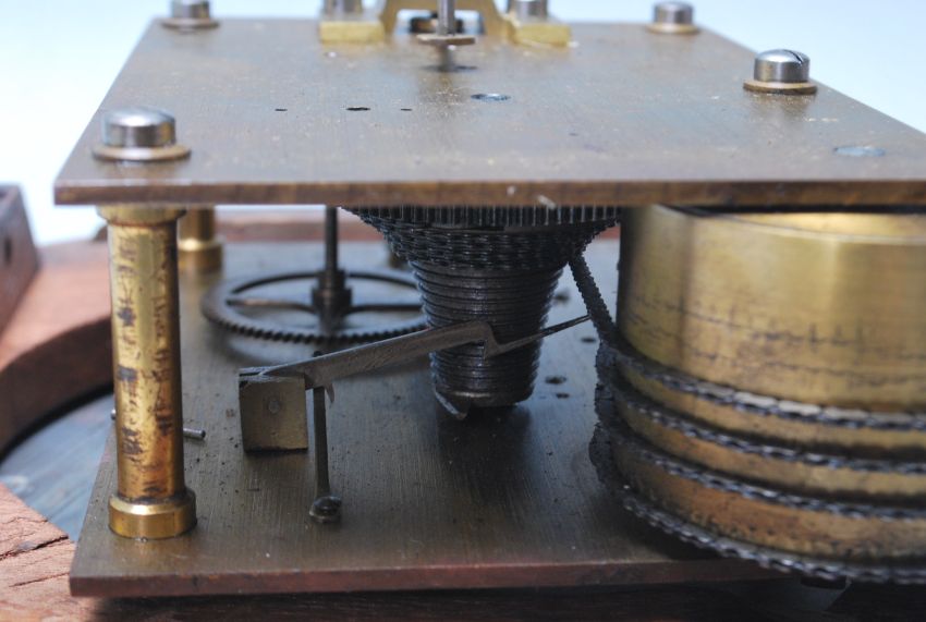 A vintage mid 20th Century 1940's WWII era military issue Prescott clock with fusee movement, a round oak case, the face having aged white enamel with roman numerals to the chapter ring with a trace of crows foot above the makers mark. Diameter: 28 cm.