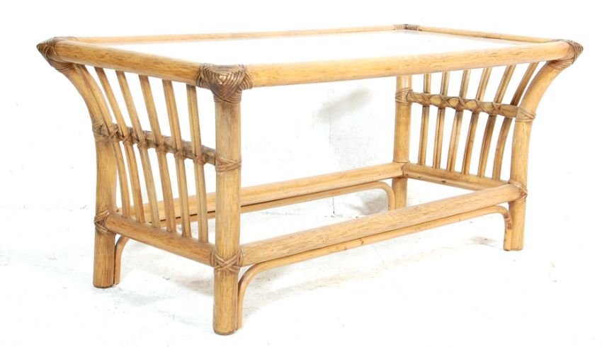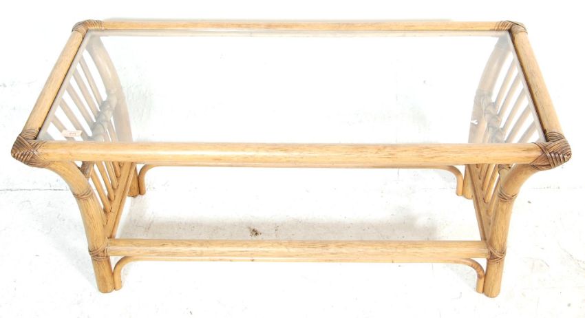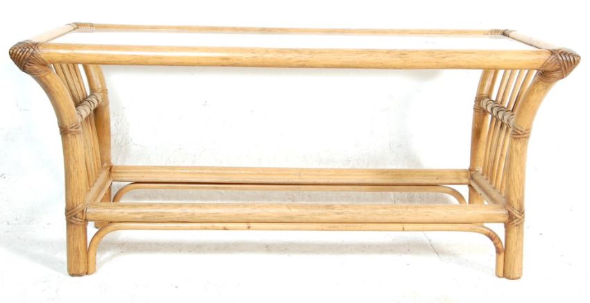 A retro vintage 1970s bamboo coffee table of rectangular form having a glass tabletop over a single undertier.