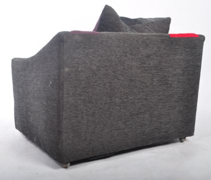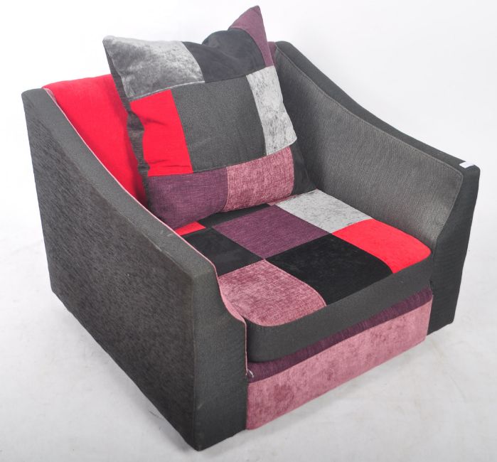 A 20th Century retro style low easy lounge chair / armchair of good deep form having running sweeping arms. Large cushioned backrest and seat with all being reupholstered in chequered fabric. Raised on ball castors. Measures 68cm x 94cm x 83cm.