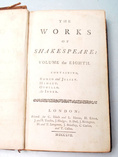 1757 - The Works of Shakespeare - Volume the Eighth containing Romeo and Juliet, Hamlet, Othello, An Index. Printed for C Hitch and L. Hawes London. Leather Bound MDCCLVII
