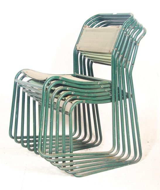 A set of six retro vintage mid 20th century Industrial tubular metal stacking chairs ( dining )  having green canvas seats and backrest with a green painted tubular frame.