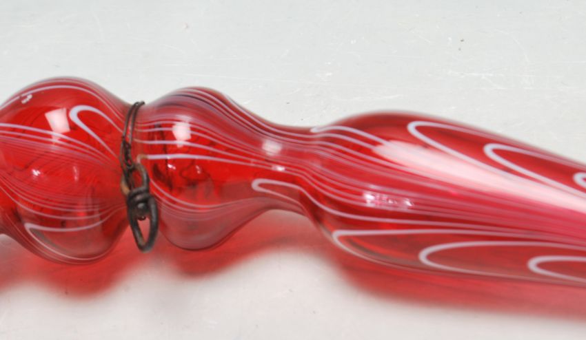 A large 19th century Victorian Nailsea cranberry glass pipe with white enamel paint decoration to the body and blue enamel rim. Measures 47 cm long.