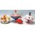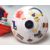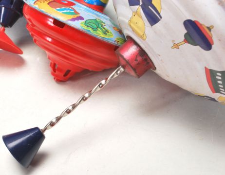 A set of four mid century and after metal tin spinning toys / tabletop spinners of a UFO form with push handle atop and bright colourway.