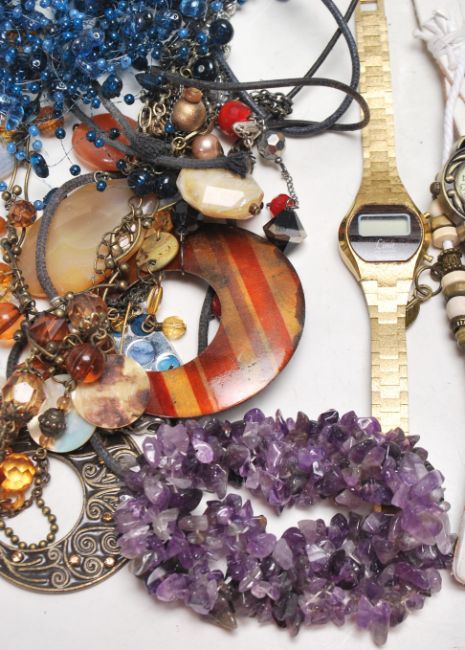 A collection of vintage costume jewellery to include two gilt Everite cocktail watches, a Sekonda bark effect watch, a gilt Rotary watch with a mother of pearl face, an Avia 15 jewels watch, various beaded necklaces, earrings etc.