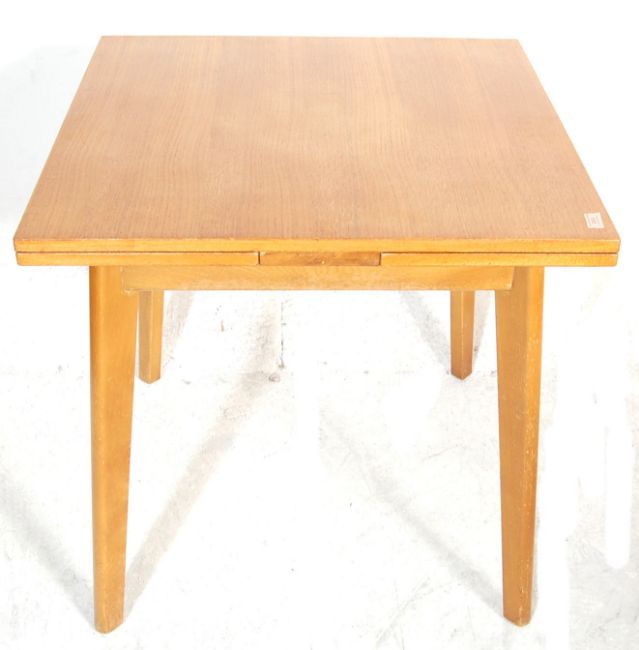 A vintage retro mid 20th Century 1950's extending dining table raised on angular splayed legs with folding rectangular top to the top. Measures 75cm x 140cm x 77cm.