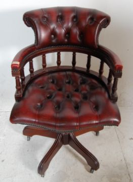 A 20th century oxblood red Leather Chesterfield Captains deep button back mahogany framed swivel office / desk chair having a spindle gallery back raised on a splayed base. Measures H 114 x W 48 x D 42 cm.