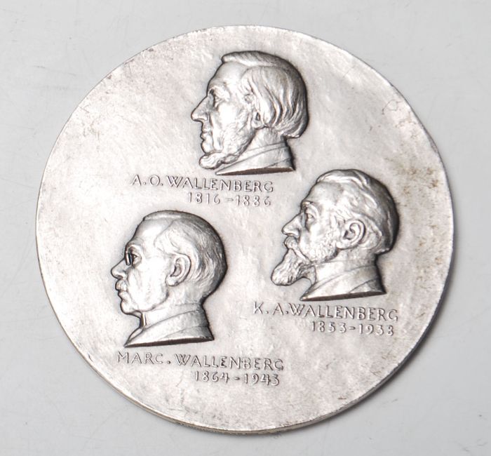 A Swedish silver Commemorative Medal, silver d.63mm: Commemorating the Enskilda Bank, Stockholm, featuring three portraits of previous governors A.O. Wallenberg 1816-1886, K.A. Wallenberg 1853-1938, and Marc Wallenberg 1864-1943, EF. Hallmarked to the side. Total weight 99.71g. Diameter: 6 cm.