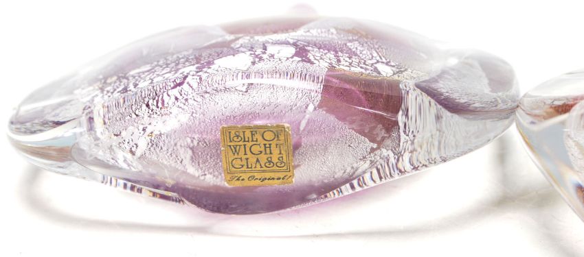 Michael Harris - Isle of Wight Glass. A graduaing pair of later 20th Century Isle of Wight glass Black Azurene Fish vase, internally decorated with silver and gold aventurine over a dark ground and heavily cased in clear crystal. All in the manner of Michael Harris