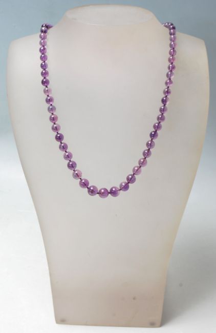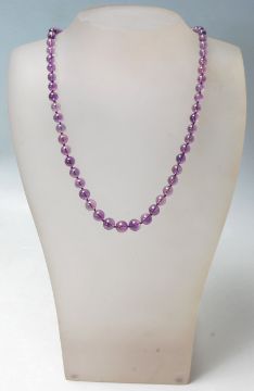 An early 20th Century Edwardian amethyst necklace made up of round purple graduating beads having a gold clasp set with a further amethyst cabochon and diamond chips. Measures 19 inches.