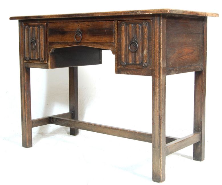 A 1920's Ipswich style Jacobean revival  oak desk / knee-hole writing desk. The desk being raised on turned legs with linen fold carved drawers under desk top above. The drawers with knob handles. Measures 77 cm high x 107 cm wide x 50 cm deep.
