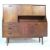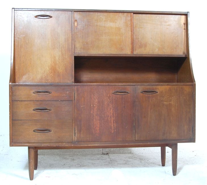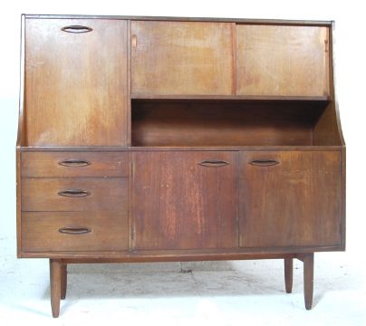 A vintage mid century teak wood highboard / sideboard having sliding doors atop with drop front door to the left, twin doors cupboard underneath and a bank of three graduated drawers to the left. Raised on shaped supports. Measures 127cm high x 132cm wide x 42cm deep.