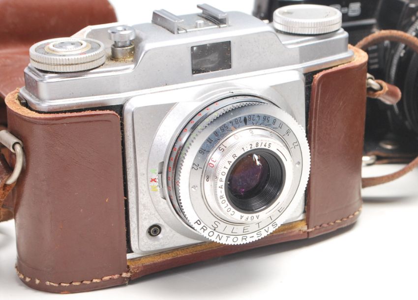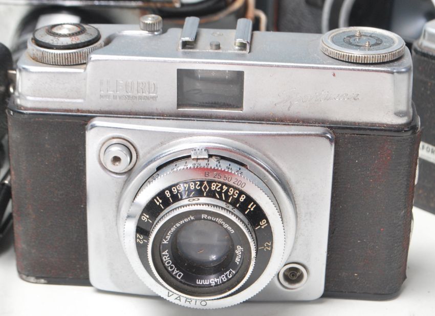 A large collection of 35mm cameras / photographs cameras to include Praktica IV F, Exakta Varex II b, Ilford Sportsman x2, Agfa, Halina Paulette Electric, Kodak 355X Instamatic, Praktica Super TL2 and others.
